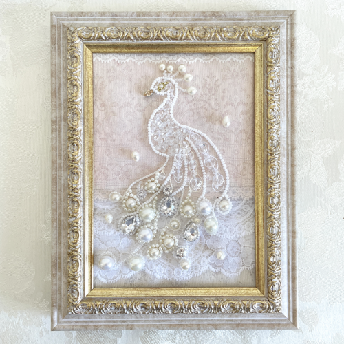 高級クリスタルや上質パールを使って、孔雀のしなやかな曲線を描きます。
